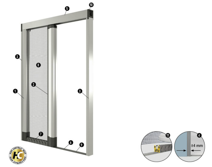 - Zanzariera laterale da 49 mm a carro con guida a terra di soli 5 mm, realizzata in PVC calpestabile, ideale per un migliore scorrimento guidato.