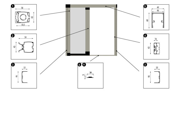 - Cuffie laterali autoportanti che sostengono la guida superiore senza necessità di viti di fissaggio a soffitto.